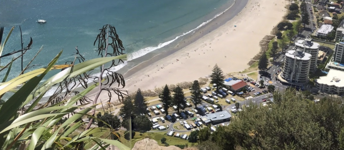 Spanning roughly four hectares and set along 115 m of beachfront, the park is divided into three terraced areas, each with modern shared kitchens, BBQ spaces, clean toilets, showers, laundry, and disabled-access facilities. Wi‑Fi is available. There are approximately 206 powered sites with ocean, harbour, or Mauao views. A dump station is also available onsite. Bookings required in advance.